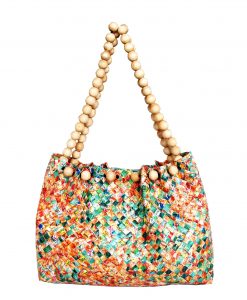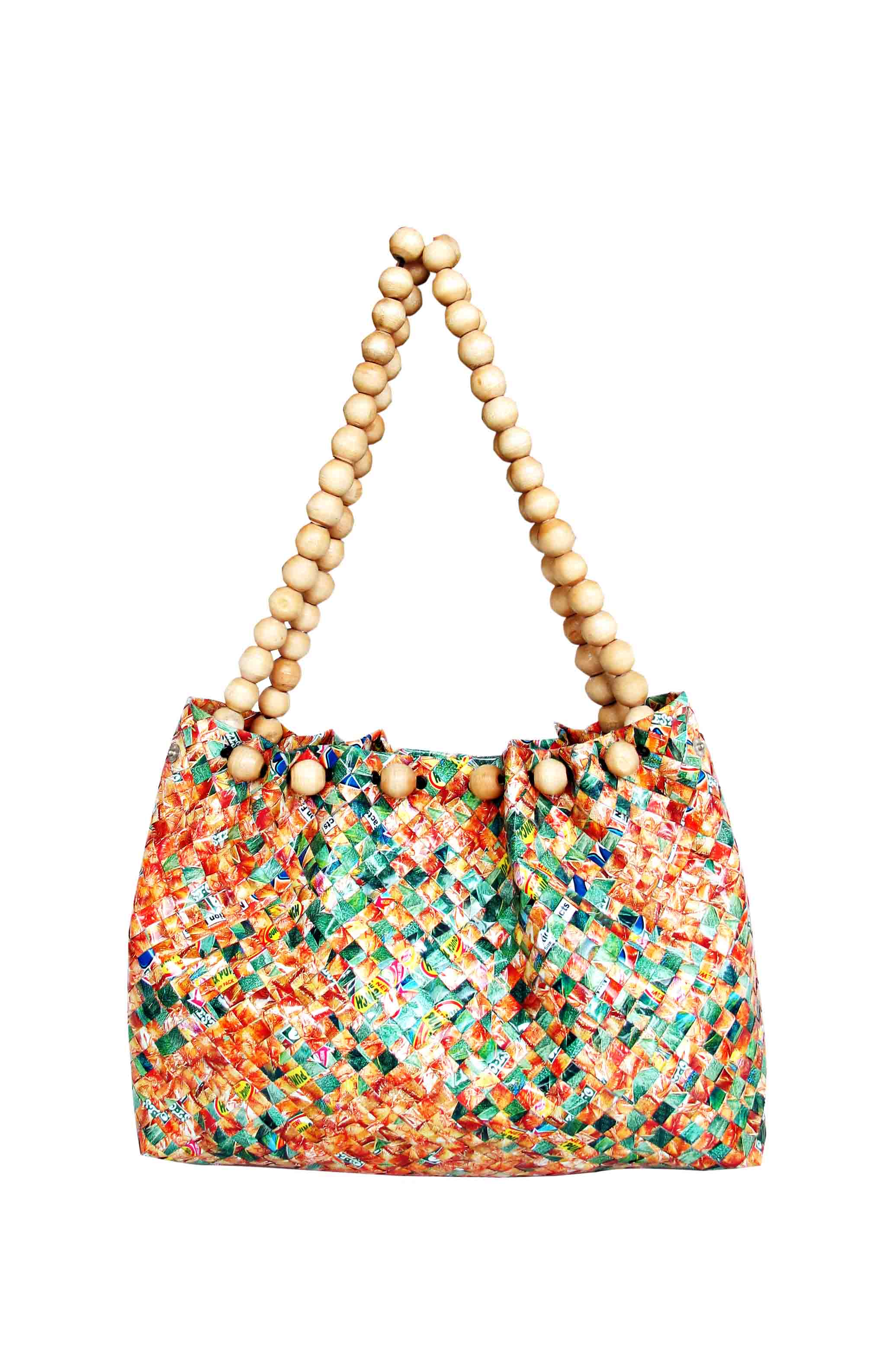 Sac tissé avec les anses en boules bois, recyclé en emballages de jus de fruits