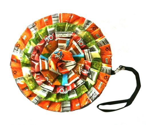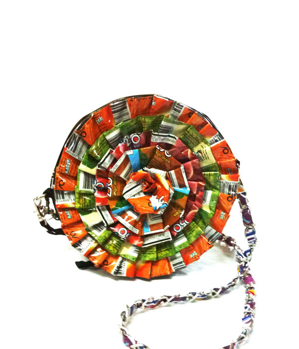 Cross body, flower round bag, recycled from fruit juice packaging.